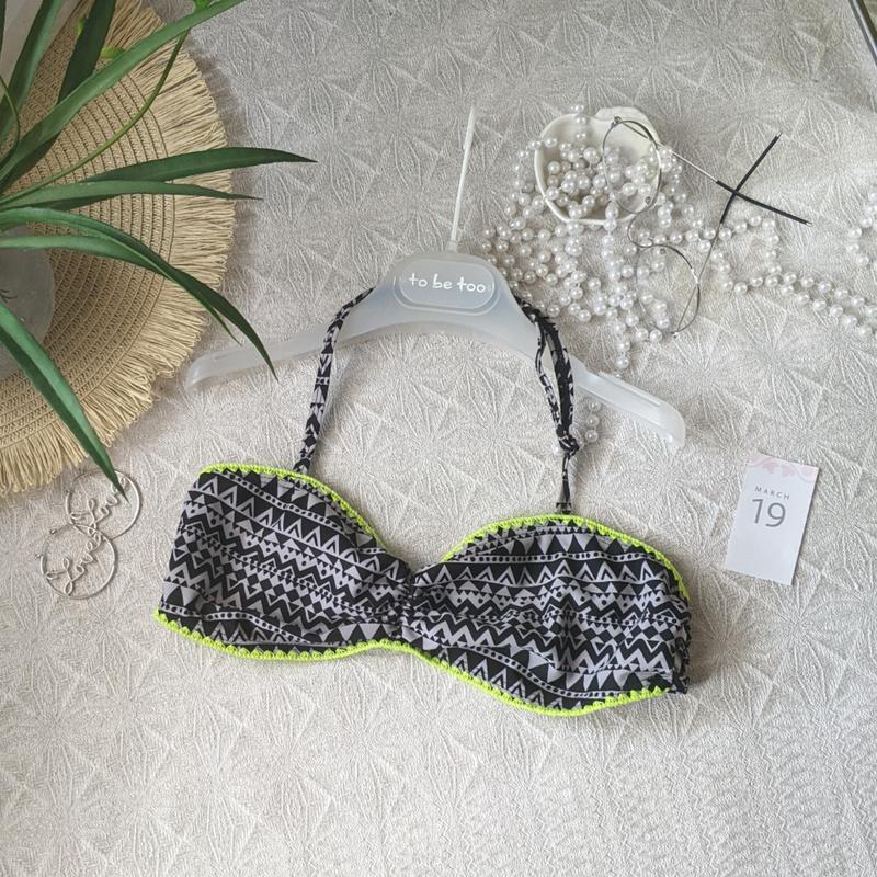 Черно-белый верхний купальника бренд F&F 11 -12, но больше на 13 - 14 достаточно большой по объему длина до 83 три полоскалки регулировки и застежка верхняя бретель подсохла.