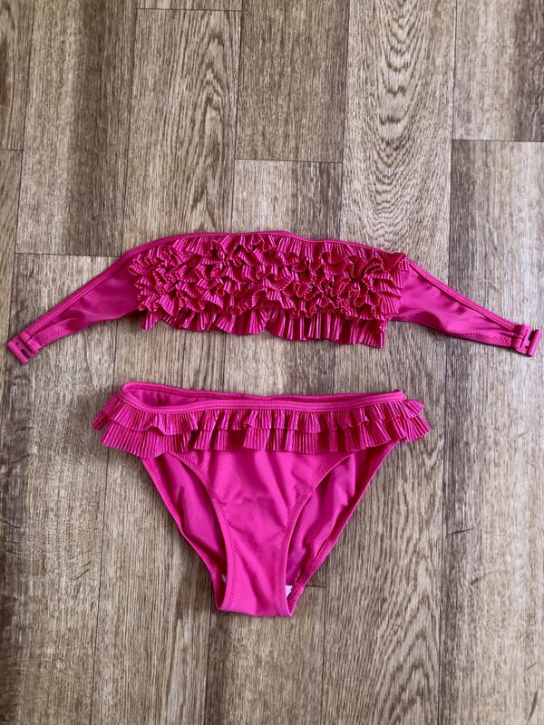 Шикарний купальник на 10 р. Можна сказати в ідеальному стані, але є на попі маленька пляма. На останньому фото я вказала. Купляли в Італії за 29 €.. Склад: поліамід - 82%, еластан - 18 % Ліф; Довжина повністю - 47 см. Ширина ліфа - 8 см. + ще рюшки 2 см. Плавки; Ширина - 26 см. Висота з переду - 18 см. Висота ззаду - 19 см. Товщина з боку з рюшками - 5 см.