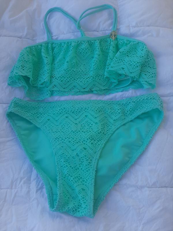 Купальник для дівчинки бірюзового кольору на 10- 12 років Заміри Верх-топ Півобхват по грудях-32см Висота топа-11см Плавки Півобхват по талії-32см Висота плавок-21см УВАГА!!!Це заміри в нерозтягненому вигляді. Врахуйте те,що купальник ще тягнеться Стан ідеальний,стан нового