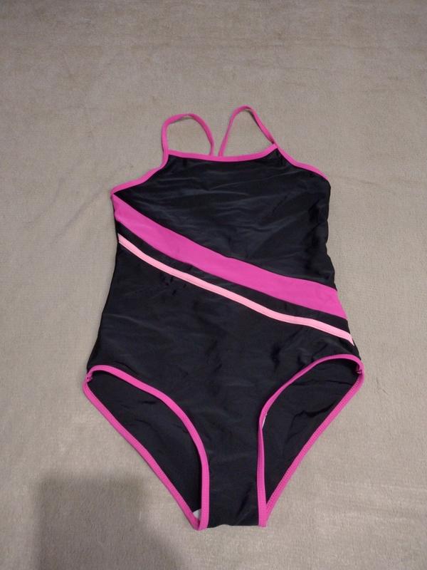 Новий купальник чорного колтору з вставками колтору фуксії та пожевою полоскою, на зріст до 140 см. Ідеальний для занять спортом в басейні, для плавання в річці. ПОБ-31см., ПОТ- 27 см., боковий шов - 26 см. Додаткові заміри - по запиту. Гарна якість.