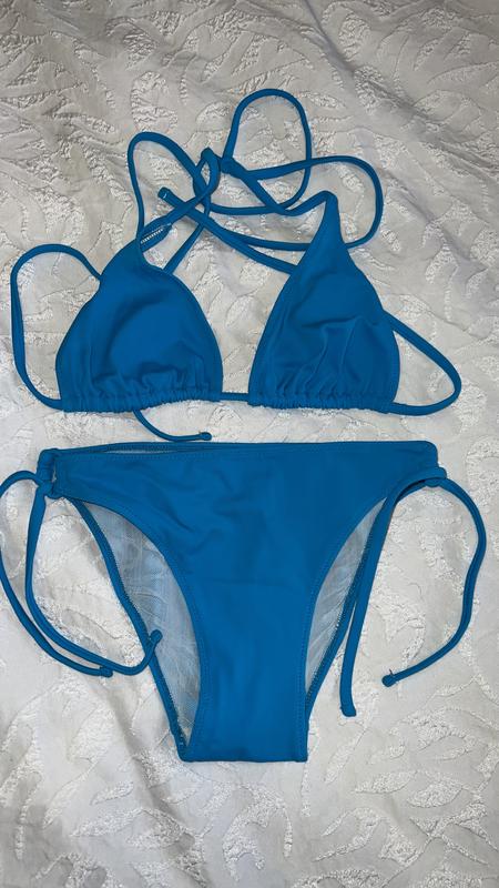 Яскравий та модний купальник, який ідеально підійде для літа! • Колір: Насичений блакитний • Верх: Трикутний ліф з регульованими завʼязками на спині та шиї Трусики з завʼязками по боках Матеріал: Мʼяка та еластична тканина, що швидко висихає