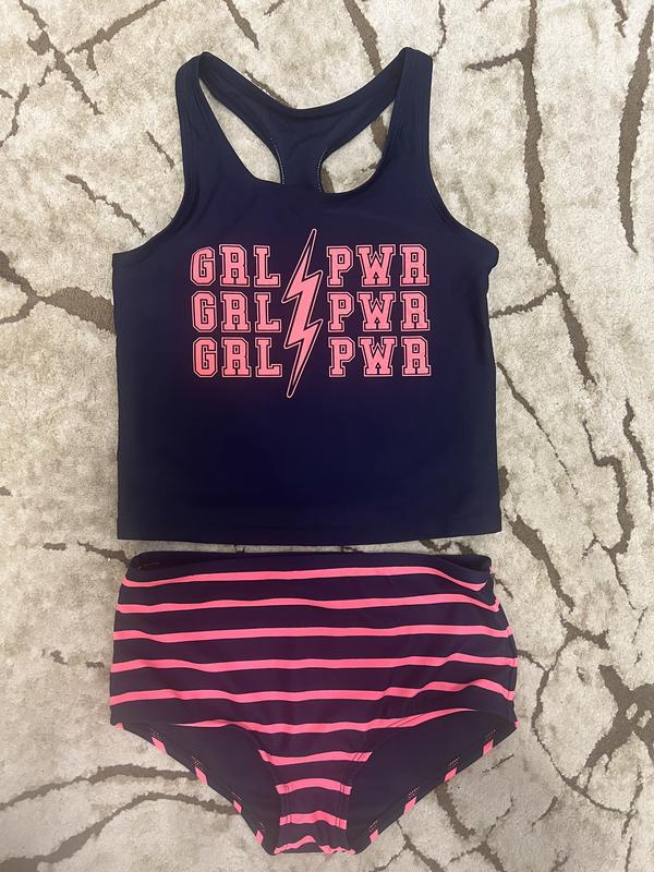 Дуже гарний та стильний купальник. Gap, оригінал. Абсолютно новий, але бірка зірвана. Не використовували, просто лежав. Гарне поєднання темно синього та рожевого кольорів. Вік 6-7 р. Довжина топа від шлейки 37.5 см., ширина 29 см. Трусики довжина посередині 22 см., ширина 27 см.