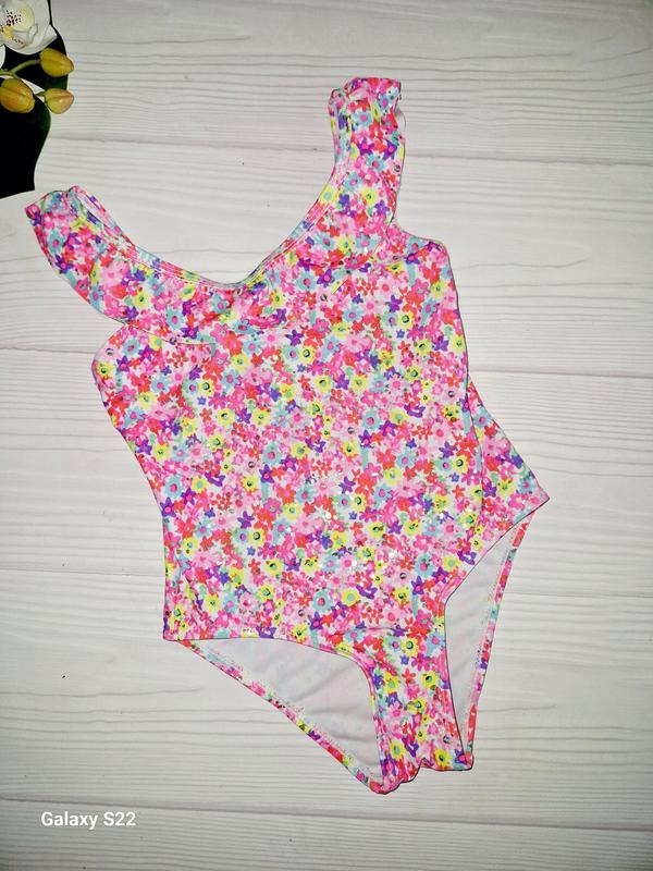 Яскравий блискучий суцільний купальник в квітковий принт на 5-6 років