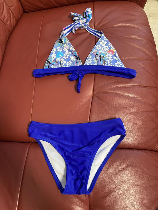 На тілі немає, заміри на фото)звичайні трусики,бюстгальтер одягається на шию і ззаду регулюється шнурівкою до потрібного розміру,колір яскравий)підійде на 5-7 років) орієнтуйтеся по замірах) З нюансів,на трусиках зрізаний поясок так як зламався і тріскаються гумки,на вигляд і купання не впливає,продається так як є без повернення і притензій)