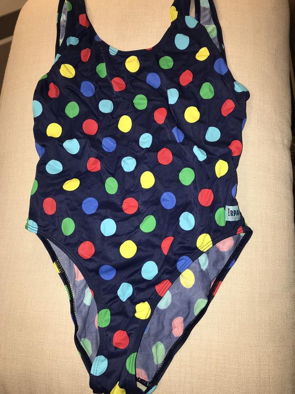 Цельный купальник темно-синего цвета в разноцветный горох. Декларирован по спинке баской и милыми яркими бантиками. Для девочки 14-16 лет.