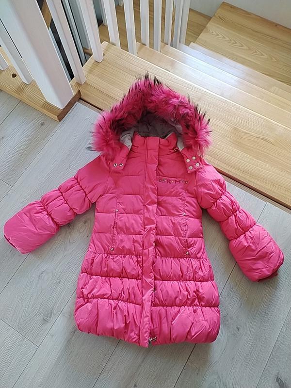 Куртка зимова 6-8 років. Теплюща довгенька курточка-пуховик. Пошита на совість. Якісна плащівка, рукавчики під низом на резиночці, велюрова підкладка. Замки в нормі, плям затертостей немає. Хутро натуральне, знімається за необхідності.