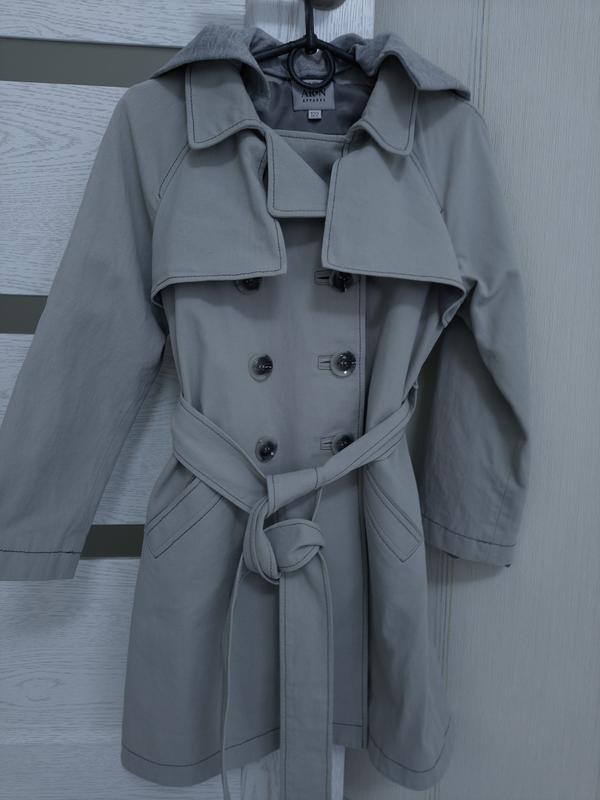 тренч сірого кольору з капюшоном,який можно знімати.Тканина котон.Підкладка віскоза.Довжина 66см, рукавчик внутр.сторона 31,5 см