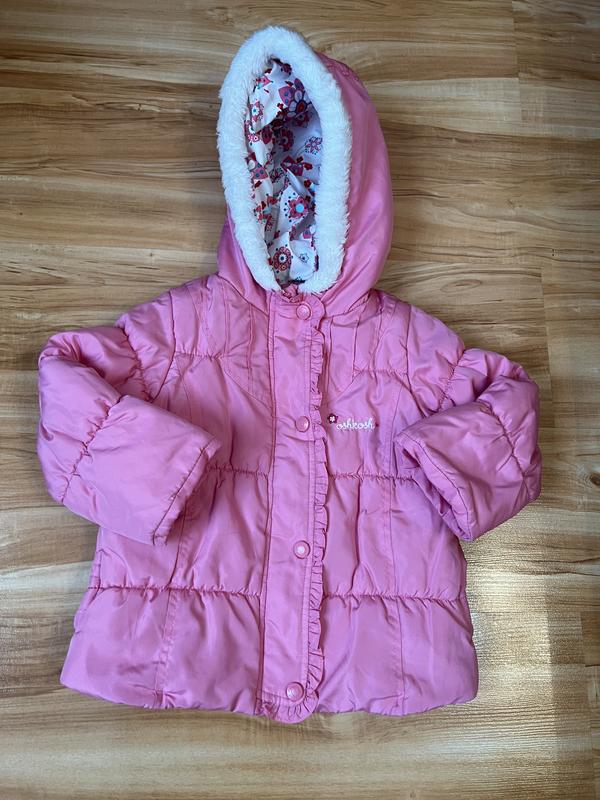 Рожева куртка від oshkosh утеплена на осінь. На вік 3 рочки. Довжина рукава 35 см. Довж. куртки 42 см. Плечі 26 см. Стан ідеальний, але є ньюанс, на останньому фото видно маленький проріз- практично не видно.
