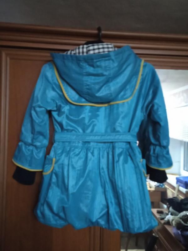 в очень хорошем состоянии,утеплена синтепоном,теплая,чистенькая,без недостатков,манжеты на шее и рукавах защищают от ветра,плотная и красивая,есть капюшон,карманы,пояс,цвет голубой,8-9 лет