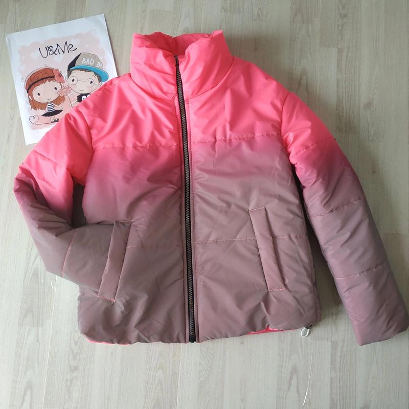 Світловідбиваюча демісезонна курточка для дівчинки. Тканина світловідбиваюча плащовка грарієнт-неон. При звичайному світлі низ куртки темна пудра, Наповнювач синтепон 150 по низу куртки є утяжка, можна робити куртку пуфф розмір/рукав від горловини/пог/довжина 152р/71/48/61 158р/73/49/63 похибка +-2см