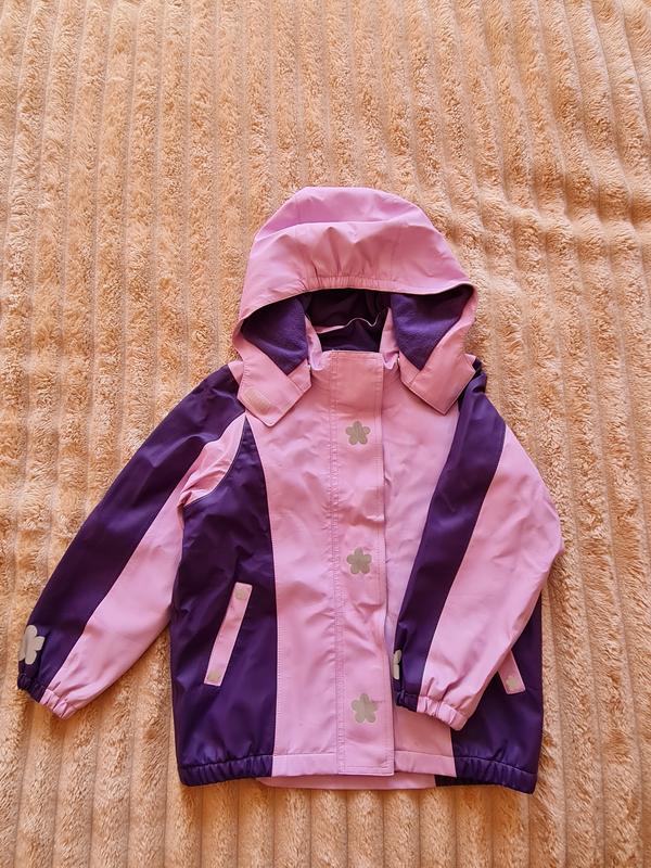 Куртка на замочку та липких стрічках. Є капюшон, який відстібається (на ґудзиках). Також є світловідбивні наліпки (трішки потріскані, але цілі). Всередині вкрита флісом. Є незначні недоліки