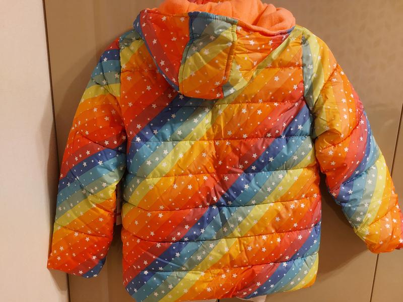 Нова терла курточка, на холодну осінь, дуже яскрава. Підкладка флісова, утеплена синтепоном. Замовляли на офіційному сайті, прогадали з розміром. Довжина курточки 57 см, рукав 53 см.