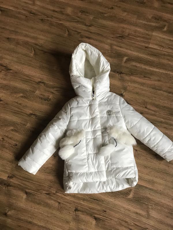 Біла курточка. Дліна 46-53см, рукава 42см, ПОгруді 32см, плечі 32см. Нюанс - помірялася мех с капюшону. Сбоку на рукаві декоративна легат с буквами. Тепла.