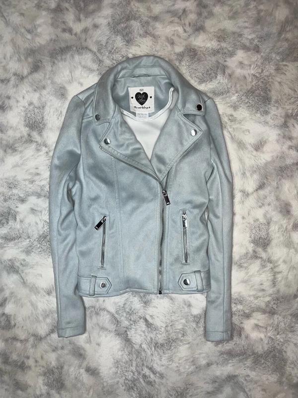 Замшевая косуха нежно-голубоглазо цвета Спереди 2 кармана Качественная фурнитура Состояние идеальное без дефектов 🏷F&F 11-12 лет Длина 51. ПОГ 43. Рукав 58. Плечи 34