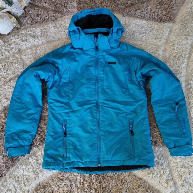 Лижна куртка. В загальному стан ідеальний, але ззаді є маленька чорна цяточка (фото 6) ледь помітна. Розмір 158. Виміри: Довжина спереді 60 Довжина ззаді 64 Рукав від ошийка 68 Ширина під руками 49