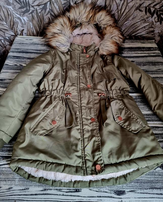 Куртка парка на дівчинку 4-5 рочків. Заміри: напівобхват грудей 36 см, довжина рукава 41 см, довжина куртки по спинці 55 см, довжина спереду 49 см.