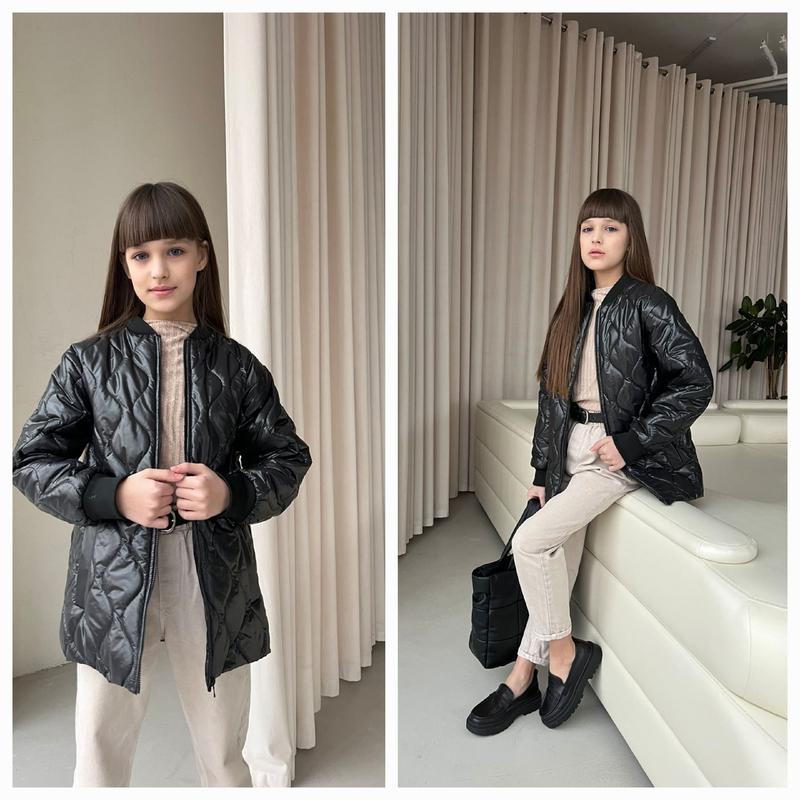В НАЯВНОСТІ 🤩НОВИНОЧКА 🤩 Стильна і модна куртка Тканина плащівка наповнювач синтепон 120 дуже гарно виглядає в живу РЕКОМЕНДУЮ! ЧОРНА 128(1 шт)-довжина 57,пог 43,рукав від плеча 57/45 134(1 шт)-довжина 60,пог 46,рукав від плеча 60/47 140(1 шт)-довжина 62,пог 48,рукав від плеча 63/50 146(1 шт)-довжина 65,пог 50,рукав від плеча 66/53