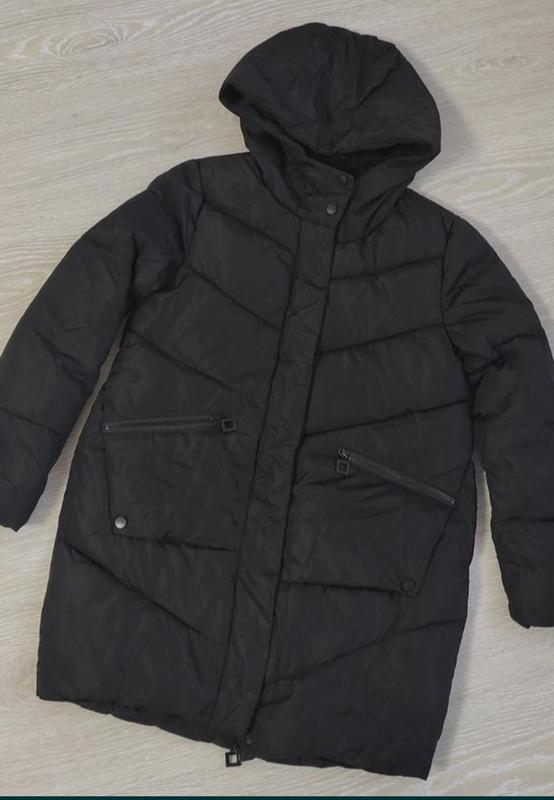 Стан нової. Гарної якості верх та підклад. Колір чорний, матовий. Наповнювач прошитий, не збитий. Стан нової. Гарна сучасна модель. Можна S, XS. Заміри полуоб'єми: ог 49 см, бедра 52 см. Довжина 76 см, рукав 59 см, плечі 39 см.