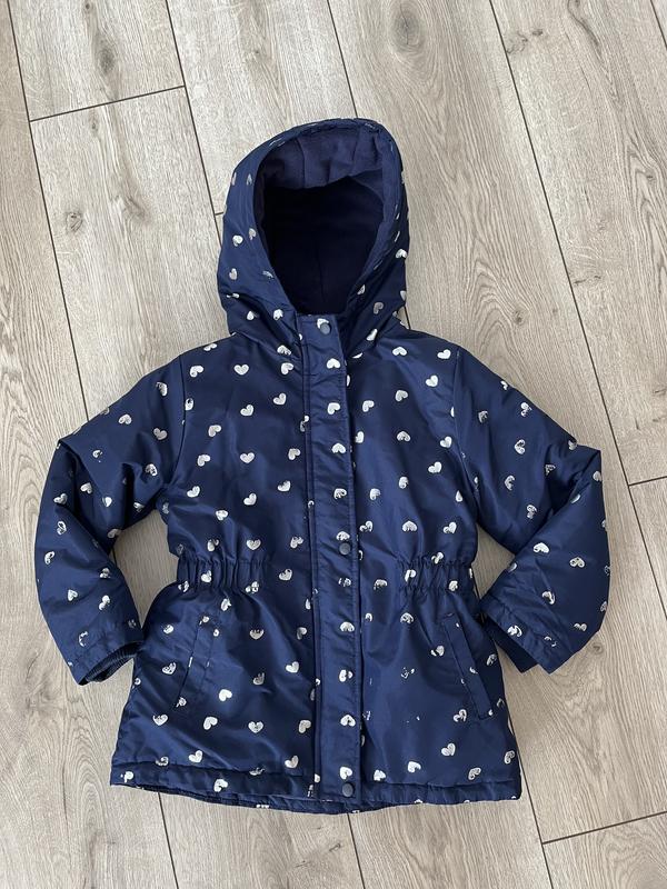 Куртка с теплой подкладкой Темно синий цвет, серебристые сердечки С выраженной талией На рукавах трикотажные манжеты Капюшон не отстегивающийся Замеры в застегнутом виде Плечи 32 Талия 34 Длина 52 Рукав 42 Некоторые сердечки имеют потертости. В основному рукава, низ куртки.