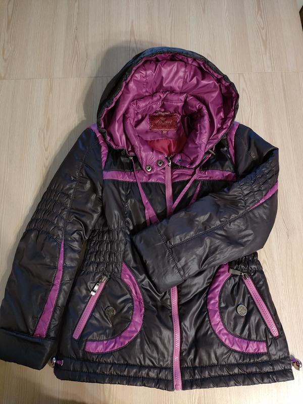 Куртка кольору баклажан з фіолетовими вставками, утеплювач - силіконовий синтепон, капюшон відстібається На 8-10 років Довжина по спині - 53 см Довжина рукава - 48 (можна розгорнути до 53 см)