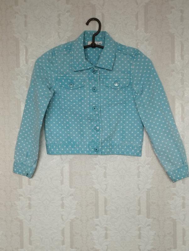 Фирменная курточка из цветного джинса.Цвет-нежно бирюзовый в белый горох.Состояние идеальное.Застежка-кнопки.Кармашки и манжеты тоже на кнопках. Замеры: длина -41см ширина плеч -30см ПОГ-36см длина рукава -47см Наложенного платежа и безопасной доставки нет.