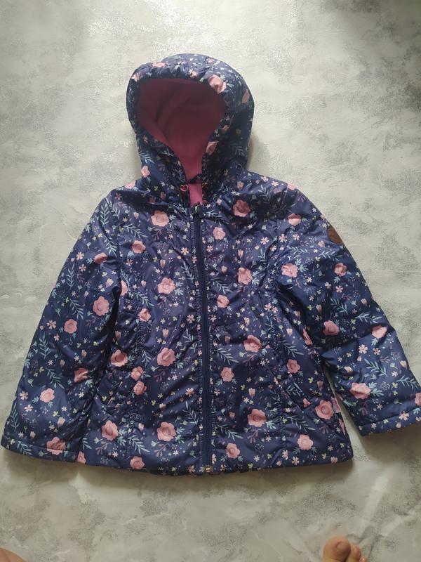 Демісезонна куртка для дівчинки на 4-5років (верх-водовідштовхувальна плащівка, на утеплювачі, підкладка фліс). Куртка з капюшоном; застібка центральна на блискавку. Кишені вшивні. Стан гарний, нюанс - манжети трішки змінили колір, але їх не видно