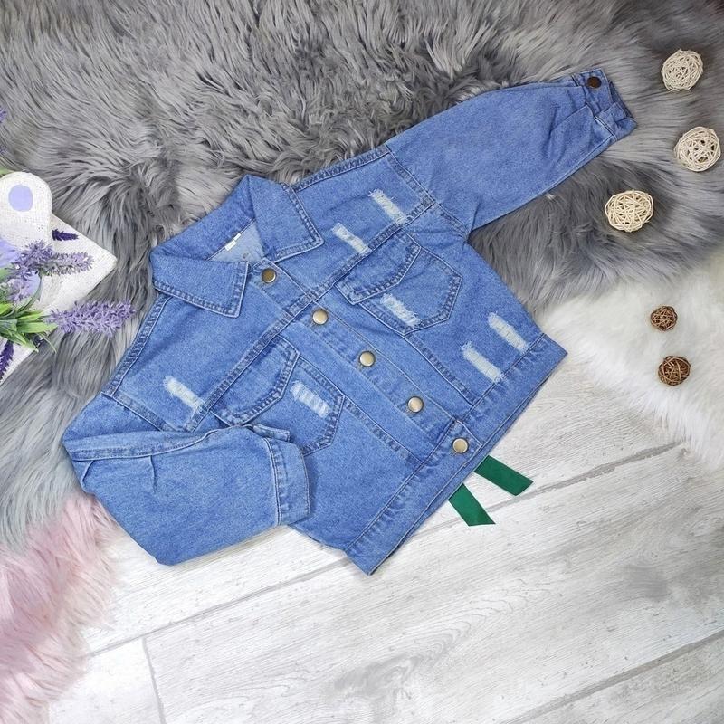 💦 Стильна джинсовочка 💦 позаду яскрава нашивка з бантиком 💦 матеріал-джинс, застібається на металеві гудзики 💦 замір рукава від горловини 💦 хітова модель ✅РОЗМІРИ В НАЯВНОСТІ: 💢 130р - 2шт 💢 140р - 7шт ✅ЗАМІРИ: 💎130р - довжина 43см, ширина 41см, рукав 53см; 💎140р - довжина 46см, ширина 43см, рукав 54см;