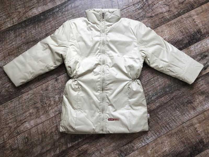 Тепла нова куртка фірми Quadri foglio на дівчинку. (140 см) Актуальний та стильний фасон. Виконана з водонепроникної щільної тканини красивого бежевого кольору. Комір стійка, у комірі захований капюшон. По лінії талії куртка затягується регульованою куліскою, що дуже сучасно. Кишені спереду потаємні вшиті невидимі. У середині також є кишеня для мобільного телефону. Наповнювач: синтепон. Одностороння блискавка Рукава з манжетом на резинці. Склад: 100% нейлон, підкладка-поліестер. Виміри куртки: Довжина куртки по спинці – 70 см Довжина рукава з плечем 61 см Ширина рукава внизу 15 см, зверху – 18 см Ширина по спинці – 39-40 см Ширина стегон – 47 см