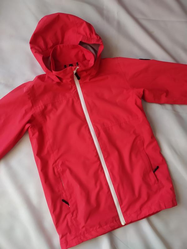 Куртка-вітровка для дівчинки. Має дві бокових кишені, одну приховану кишеню всередині, капюшон, який можна сховати у комір. Застібається на блискавку. Заміри: ширина в плечах 37см, пог 44см, довжина 63см, рукав 55см. Матеріал: поліестер.