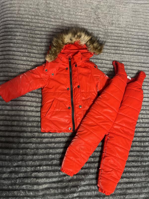 Чудова подовжена курточка для дівчинки червоного кольору, у розмірі 92.Тепленька та зручна. Наповнювач синтепон та флісова підкладка, на капішончику пух знімається, гарно переться та носиться.Легкі забруднення витираються серветкою не залишаючи плям. Штанці в кольор курточки наповнювач аналогічний куртці ніжки на манжетах тому не піддуває та можна регулювати довжину.