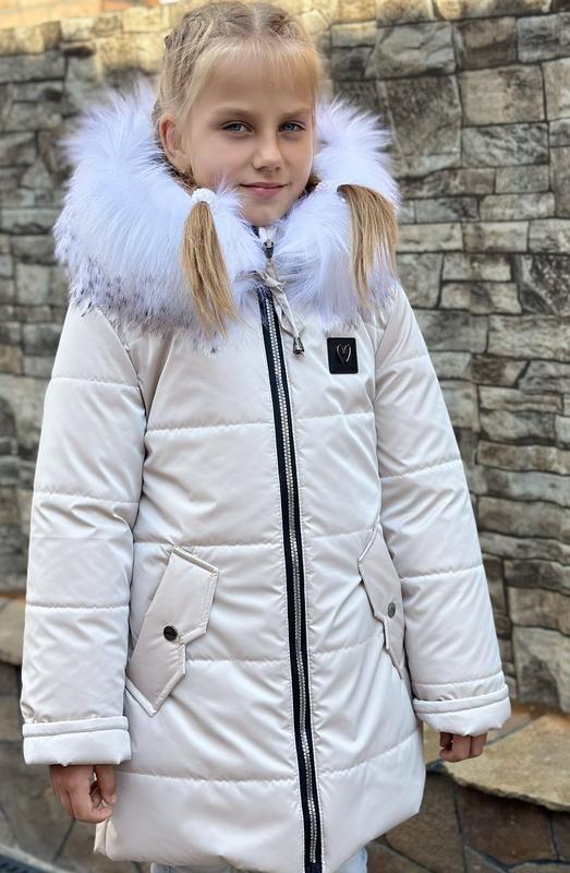 Куртка зимова для дівчаток Верх плащівка, наповнювач силіконізований синтепон 300, підкладка фліс, опушка штучна відстібається. Розміри 110- 128 см Заміри виробу: р 110 довжина 59см, пог 36см, рукав від плеча 44см р 116 довжина 63см, пог 37см, рукав від плеча 46см р 122 довжина 66см, пог 38см, рукав від плеча 48см р.128 довжина 68, ПОГ 40, рукав від плеча 50 Рукав можно підвернути на 6см