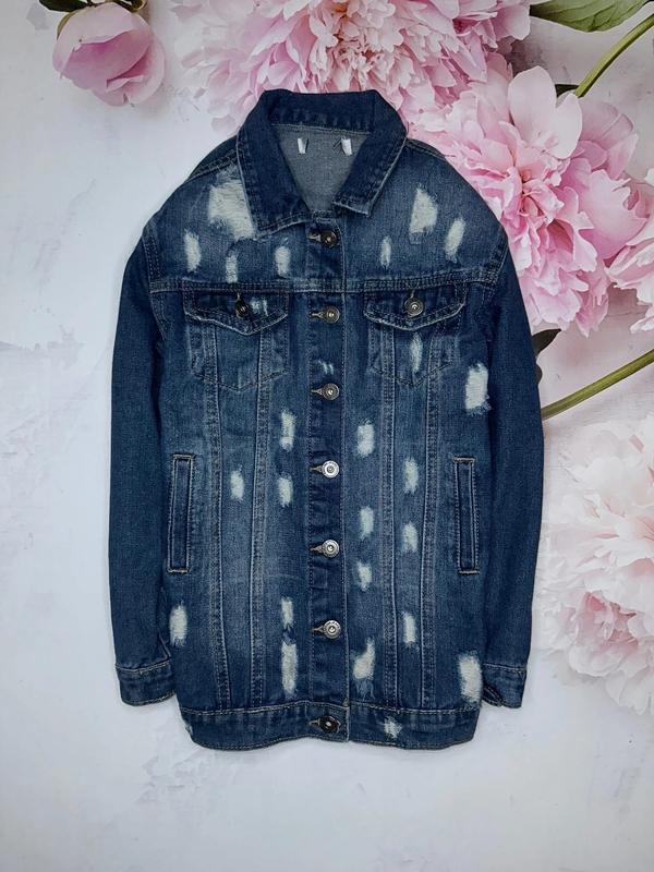 Стильная Джинсовая куртка с потертостями Удлиненный пошив Спереди 2 карманчика Состояние новой вещи 10 лет/140 р Длина 56. ПОГ 40. Рукав от шеи 57