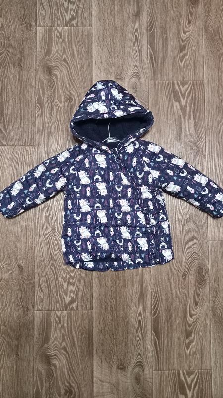 Куртка тепла, на холодну осінь. В середині сінтепон та флісова підкладка. Виміри: довжина по спинці 44 см, спереду 41см., рукав по внутрішньому шву 23см, від капюшоном 38см, пог 35 см. Розмір 98.
