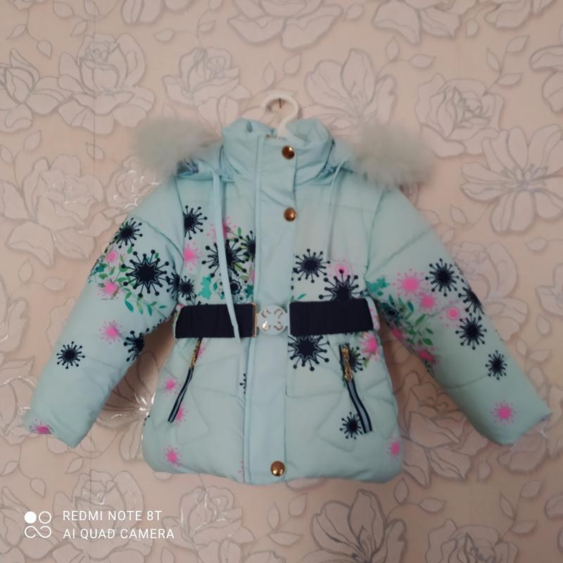 курточка на зиму, ніжно голубий колір, поясок і зірочки -темно-синього кольору, тепла, на синтепоні. Капюшон знімається, хутро з капюшона також знімається, все на замках, пів обхват під руками-32см ширина спини-26см довжина рукава-38см довжина куртки-46см