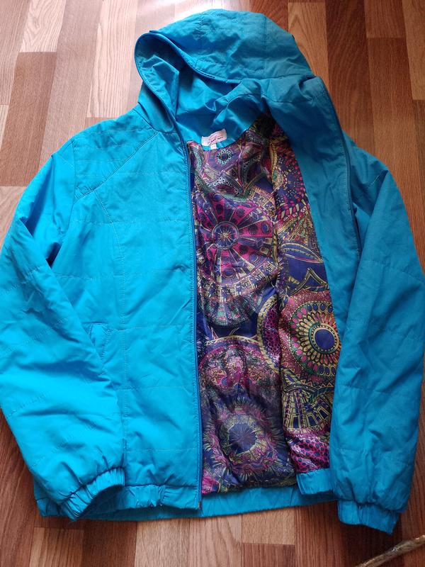 Куртка голубая красивая с капюшоном, красивой подкладкой, лёгкая, удобная, с 2-мя карманами на змейке, низ куртки и рукава на широкой резинке 3 см ПОГ 51 Длина 61 Ширина плеч 42 Длина рукава 64 см