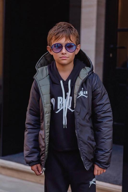 No2206 Стильна двостороння!! демісезонна курточка "Jordan" Розміри —110-116,116-122,122-128,128-134,134-140 Тканина — плащівка, наповнювач силікон 150 Двостороння куртка з капюшоном на змійці, на обох сторонах кишені Принт-накат Колір —Хакі + чорний