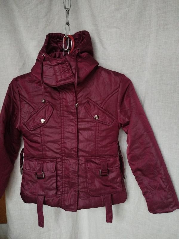 Куртка в идеальном состоянии утепления синтепоном и флисовой подкладкой. Размер 122 см. ОГ 80,рукав 46, длина куртки 50 см.Две карманы,каптур отъемный,пояс.Рукав можно подвернуть на манжет Цвет бардо плащевка с переливом..