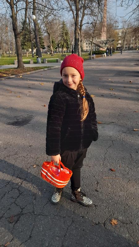 Шубка демісезонна, двухстороння:штучне хутро/плащівка, наповнювач синтепон, розмір 128,на фото дитині 6,5 років. Заміри при потребі зроблю.