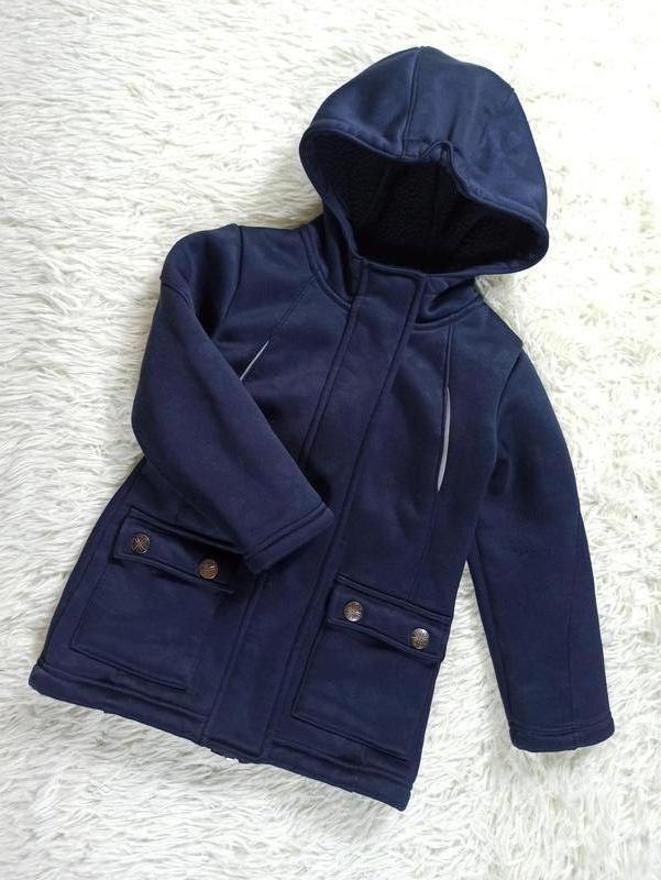 Состояние очень хорошее, лишь на левом рукаве есть небольшой износ ткани, но машинкой уберу максимально, смотрите фото4. На микрофлисе. Ткань плотная, на демисезон отлично. Два накладных кармана на кнопках. Длина 47см, плечи 28,5см, ПОГ 34см, рукавчик от плеча 35см. По бирке на 2-4 годика. По замерам - на 3-4. Покупайте и носите с удовольствием 🥰