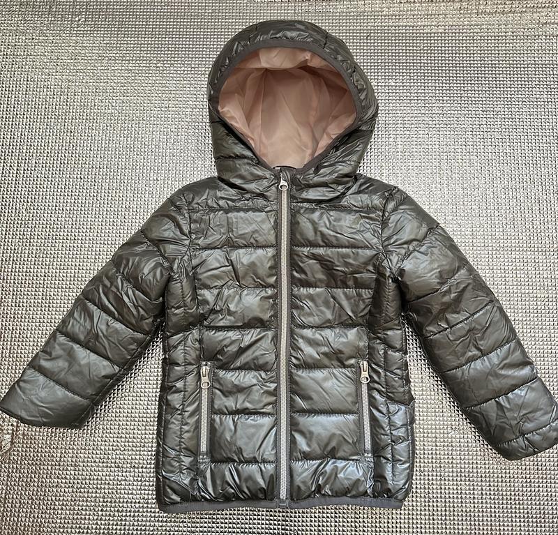 Куртка виготовлена зі стьобаної тканини розмір 98-104 Великий каптур Застібка на блискавку Дві кишені з боків на застібках