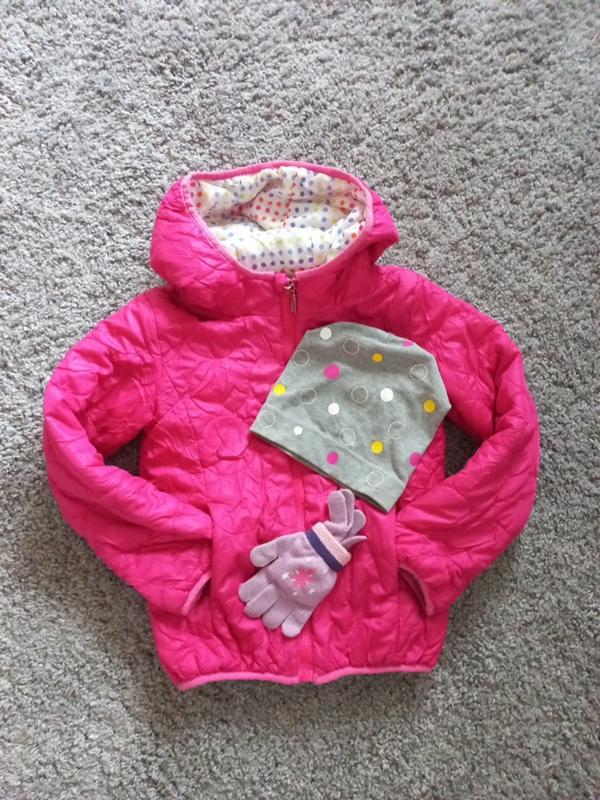 двостороння куртка, довжина 49см, довжина рукава 44см, можна підвернути. В подарунок шапка та перчатки