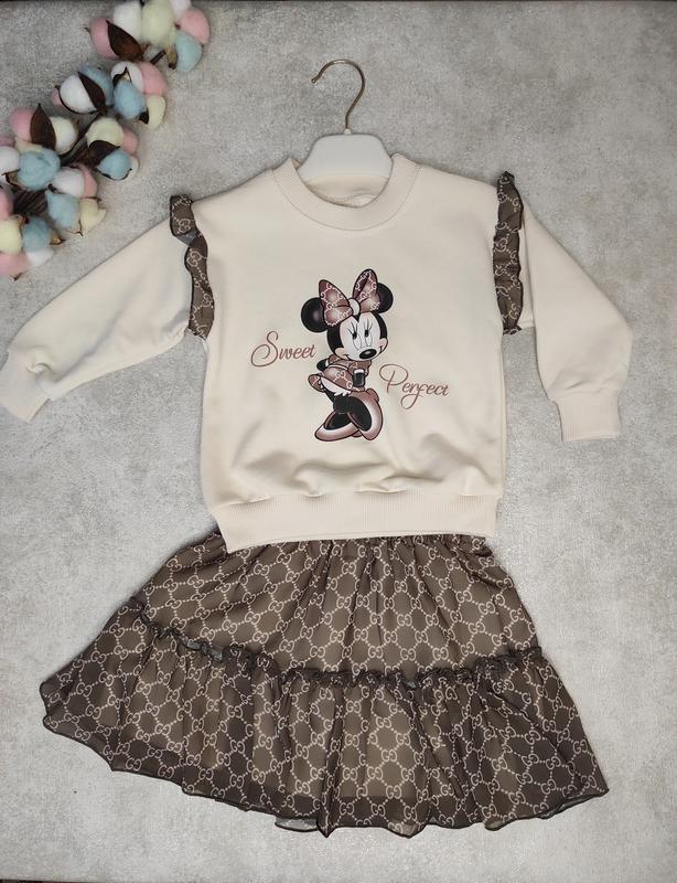 Стильний костюм для дівчинки набір кофточка+спідничка. Вік : 2 р.,3 р.5 р Заміри : 2 р-92 р.Кофта довжина -32 см, ширина -28 см, рукав( від горловини)-34 см Спідниця довжина -26 см,пояс ( на резинці)-22 см 3 р.-98 р.р.Кофта довжина -34 см, ширина -29 см, рукав( від горловини)-36 см Спідниця довжина -28 см,пояс( на резинці)-24 см 5р.-110р.Кофта довжина -38см, ширина -31 см рукав( від горловини)-41 см. Спідниця довжина -34 см,пояс( на резинці)-26 см