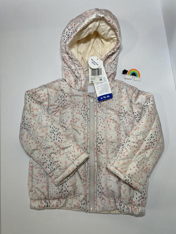 Мила куртка на дівчинку на трикотажній підкладці, водо та вітро непроникна, є кармани, розмір 68, великомірить, буде на довше Заміри Довжина рукава - 27 см По ширині під грудьми - 30 см Довжина від плеча - 32 см