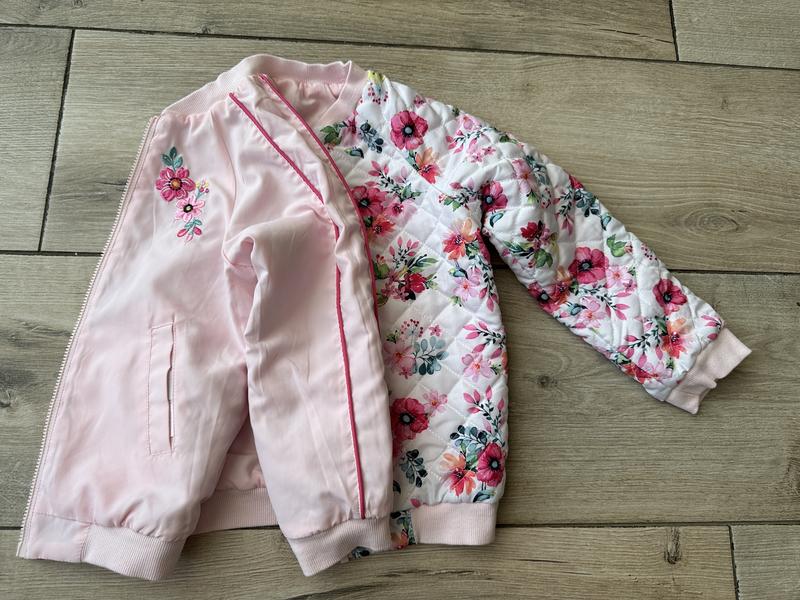 Двостороння Демі куртка Little me р.104. Одна сторона - ніжно-рожевого кольору , друга - біла у квіти. Має легеньке утеплення. Довжина - 43 см Рукав від горловини- 43 см Пог - 36,5 см У відмінному стані, як нова.