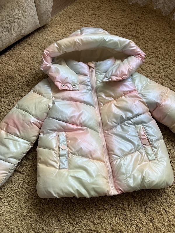 Красива тепла куртка для дівчинки на 3-4 роки, зріст до 104 см. Довжина по спині - 43 см, довжина рукава від плеча - 35 см. Має капюшон, не відстібається. Рукавички внизу мають резинку. У відмінному стані. З недоліків: спереду є невеликі затяжки.