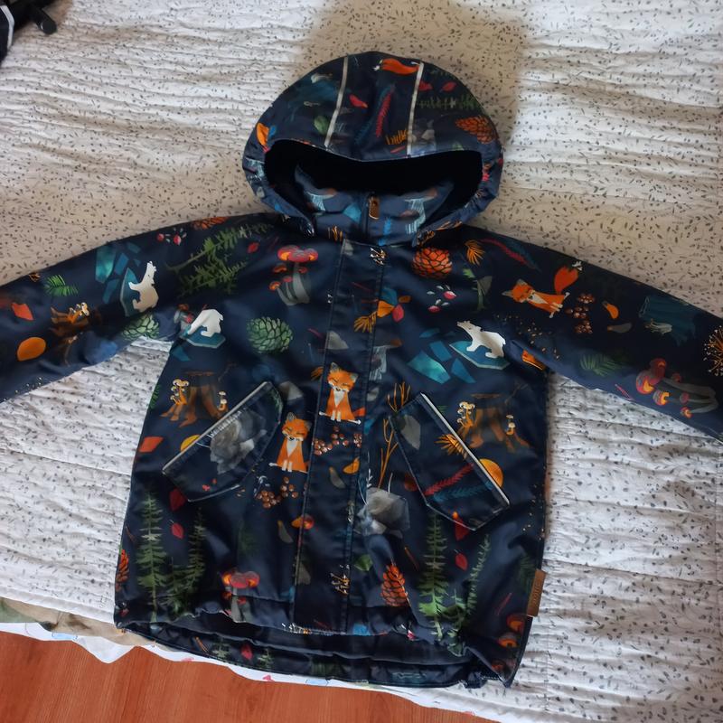 Классная куртка на холодную осень и до -10.Не промокает, глубокий капюшон.Размер 110(+6).