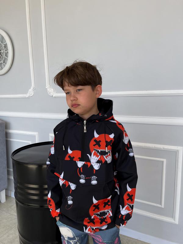 Дитячий анорак, виконаний з якісної турецької плащівки, який забезпечує надійний захист від вітру. Модель представлена в стильному чорному кольорі з унікальним принтом, що додає яскравості та індивідуальності. Ідеальний варіант для весни та осені, коли прохолодно, але хочеться залишатися модним. Анорак легко поєднується з різними частинами гардеробу, від джинсів до спортивних штанів.