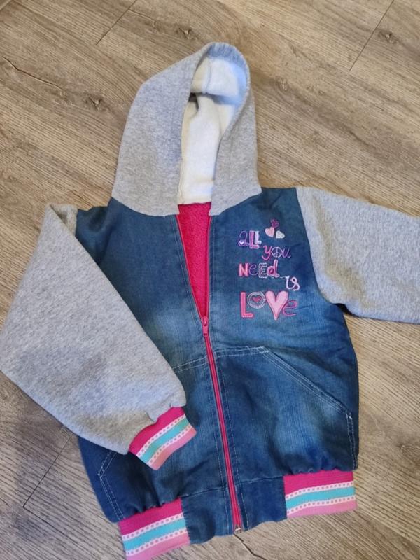 Очень теплая.Ткань под тонкий джинс на очень толстом меху,рукава трикотаж на флисе. Бирок нет , поэтому ориентировочно 5/6 лет,смотрите замеры на фото. На последнем фото указала точку,не знаю от чего, выводить не пыталась,в глаза не бросается.