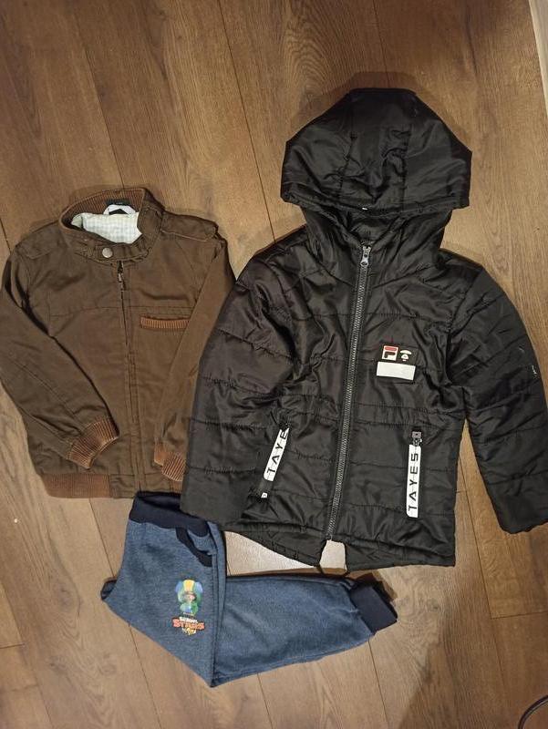 Все одним лотом. Чорна легенька. Трохи подовжена спинка. Є нюанс, фарба на рукаві. Коричнева вітрова на підкладці. Колір вже не такий насичений. Штани для дому, в подарунок ( є нюанс).