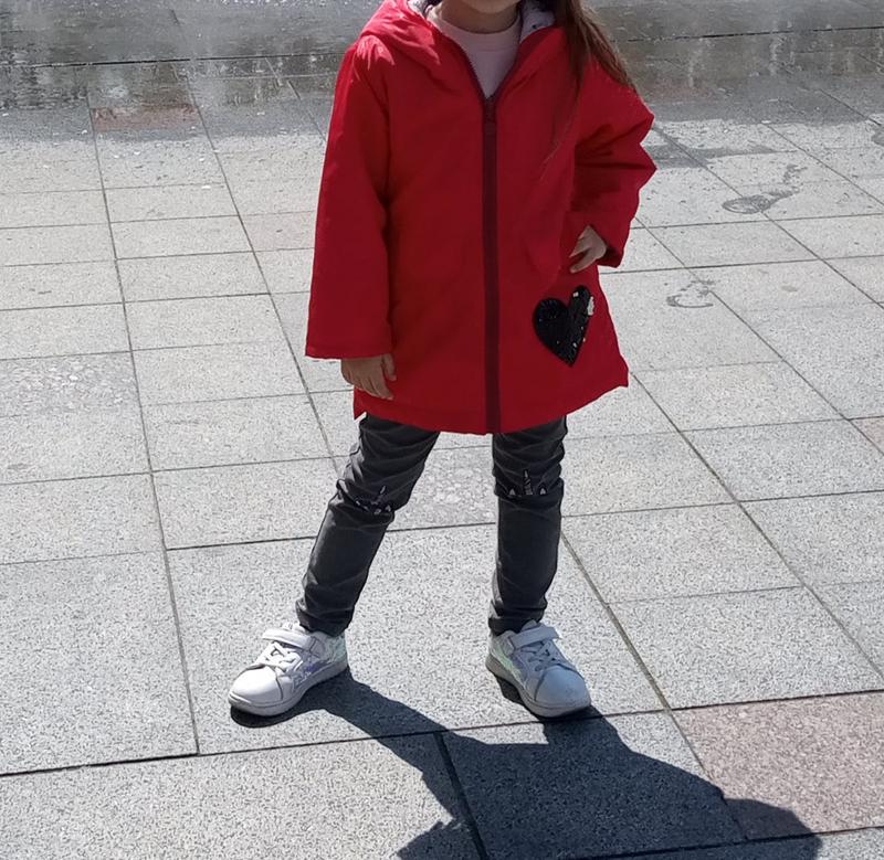 Є спереду біля замка затяжка, показала на останніх двох фото. На сердечку немає частини блискіток, але при носінні то не замітно. Дуже зручна у носінні, але донечці вже короткі рукави. 3-5 р. Довжина від плеча 52-54 см. Ширина під руками 40 см. Рукав від плеча 37 см., від шиї 44 см.